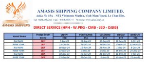 Dear Value customer, We are excited to inform RAJ RANI /001 – ETD HAIPHONG : 07 SEP will direct call COLOMBO/ JEDDAH/ DJIBOUTI ROUTING : HPH-PKLANG – COLOMBO – JEDDAH – DJIBOUTI Accept bellow on VESSEL RAJ RANI /001 We accept service to INDIA/ CGP/ MIDDLE EAST ( via PKL) also. ” NHAVA / MUNDRA / KOLKATA / KARACHI / CHITTAGONG / JEBEL ALI / SOHAR / HAMAD / DJIBOUTI / BANDAR ABBAS / JEDDAH / AQABA” SCHEDULED AS BELOW: